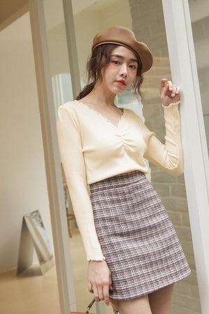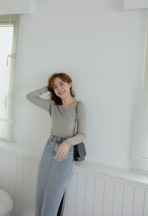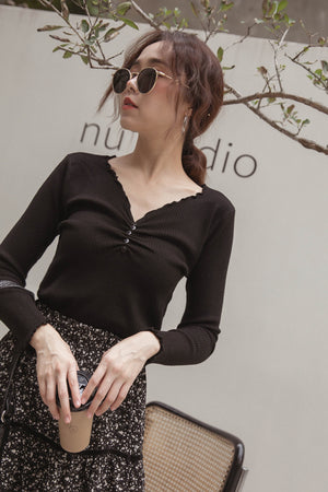 Vネックな襟元と胸元のボタンデザインで、デコルテを綺麗に女性らしく見せてくれます。
