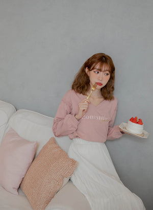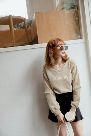 胸元の刺繍と袖のフリルがポイントのスウェットTOPSです。 デコルテ周りもきれいに見えるVネックでフェミニンさもUP。 どんなボトムにも合わせやすく、一枚持っているとコーディネートの幅が広がります。