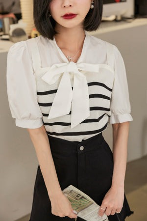 ボーダー柄半袖ニットブラウス F 【2402379】