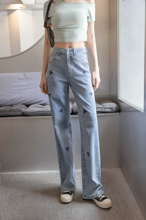 リボン刺繡ストレートデニムパンツ S~3L 【2403175】