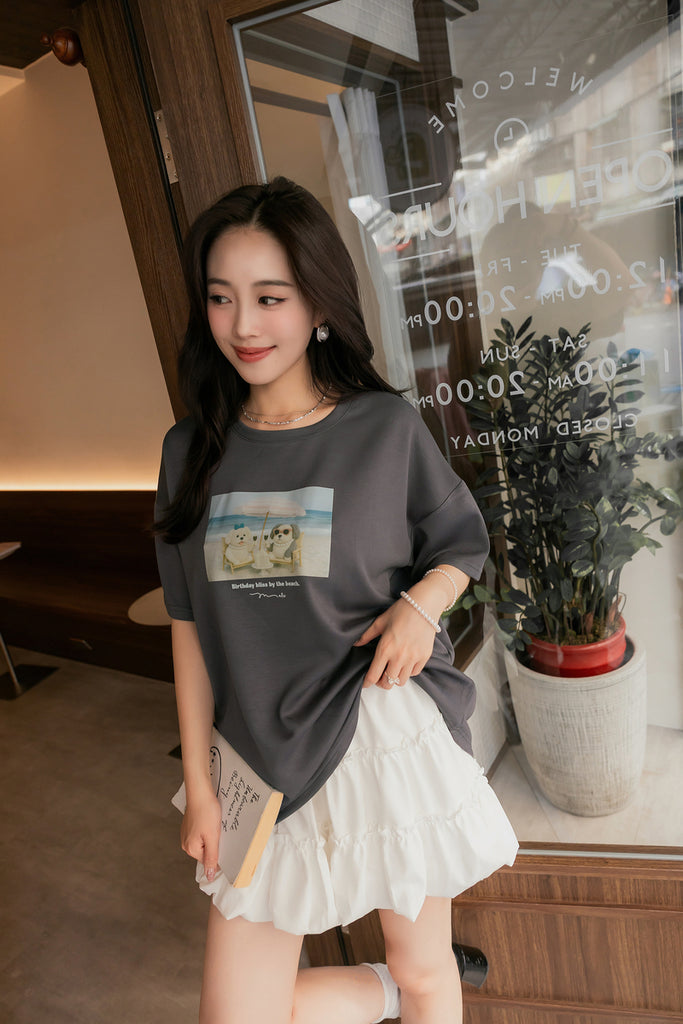 ショート丈超ストレッチ猫プリントtシャツ S~3L【2509074】