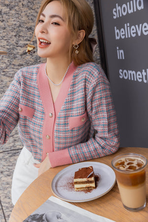 Vネックツイードチェック柄ニット F【2310012】