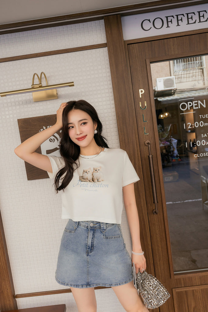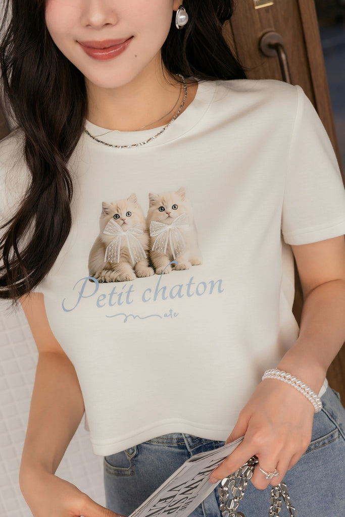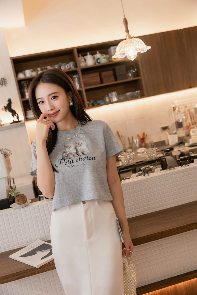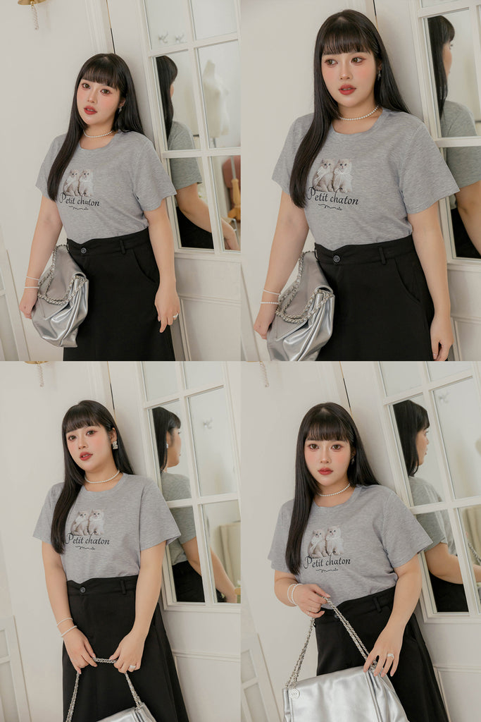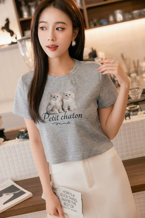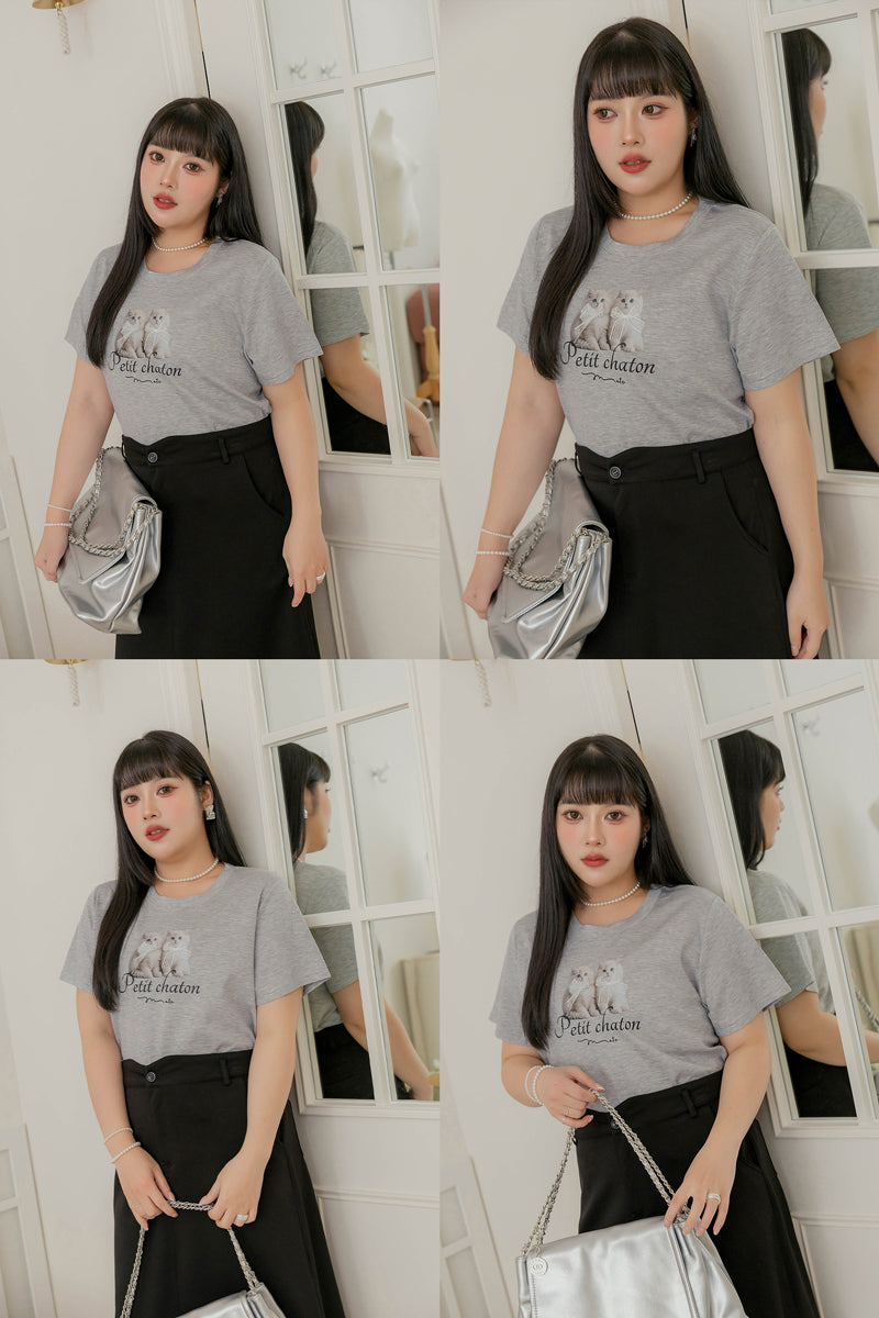 ショート丈超ストレッチ猫プリントtシャツ S~3L【2509074】